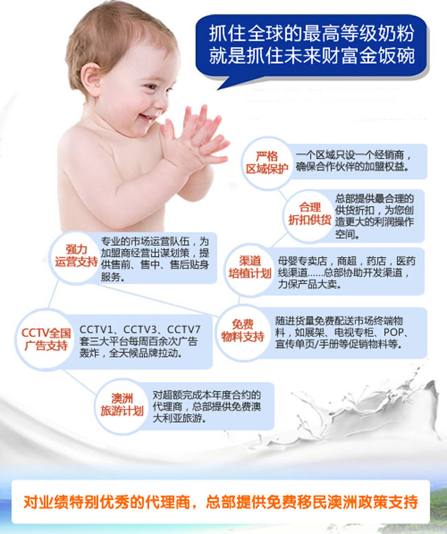 品牌名稱:澳特佳 主營(yíng)產(chǎn)品:澳特佳嬰兒奶粉招商 品牌特色:天然 安全 不上火