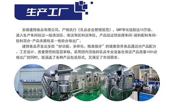 安徽建翔食品有限公司(簡(jiǎn)稱(chēng)建翔食品)成立于2003年,企業(yè)在2020年被安徽省重點(diǎn)招商引資的乳制品專(zhuān)業(yè)企業(yè),是安徽省唯一一家調(diào)制乳粉工廠,也是國(guó)內(nèi)專(zhuān)業(yè)健康食品解決方案供應(yīng)商,集調(diào)制奶粉、特色乳制品、營(yíng)養(yǎng)保健品、功能性營(yíng)養(yǎng)品等研發(fā)、生產(chǎn)、銷(xiāo)售于一體。